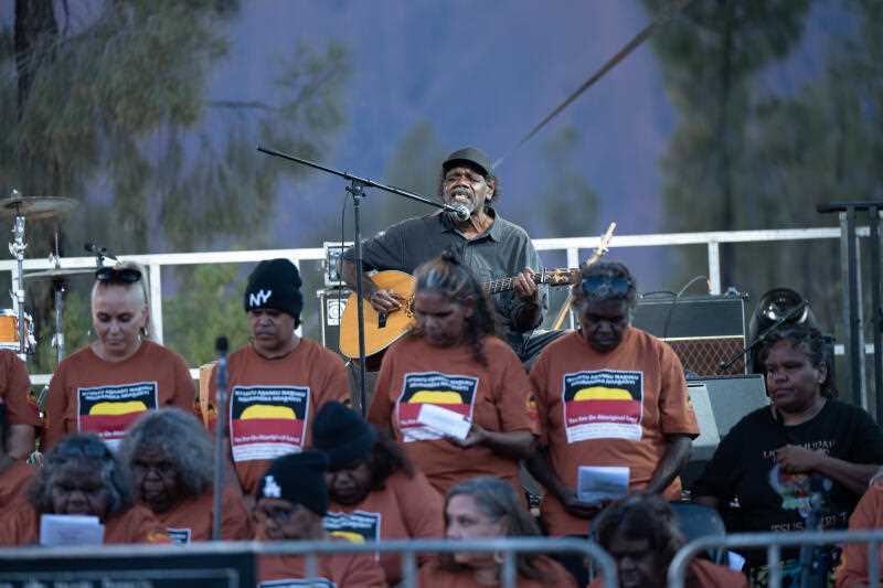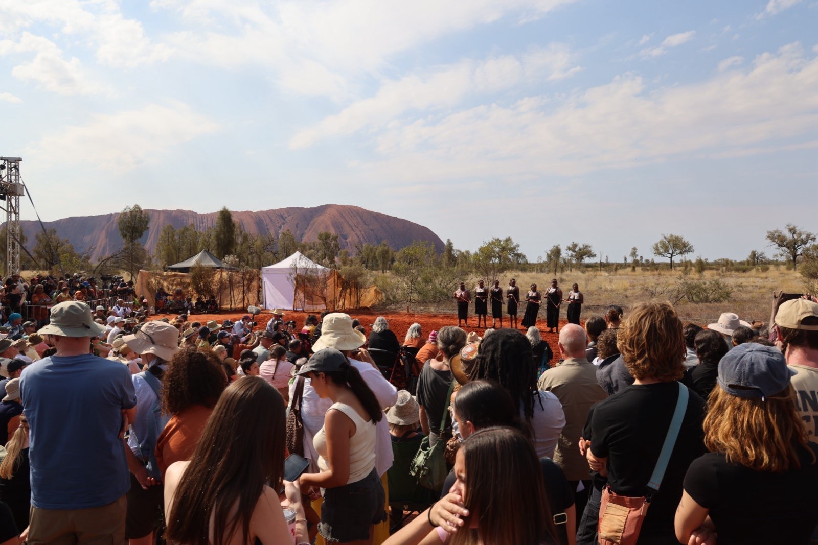 Hundreds of people – Indigenous and non-Indigenous stood in the red sand, in the shadow of the majestic rock.