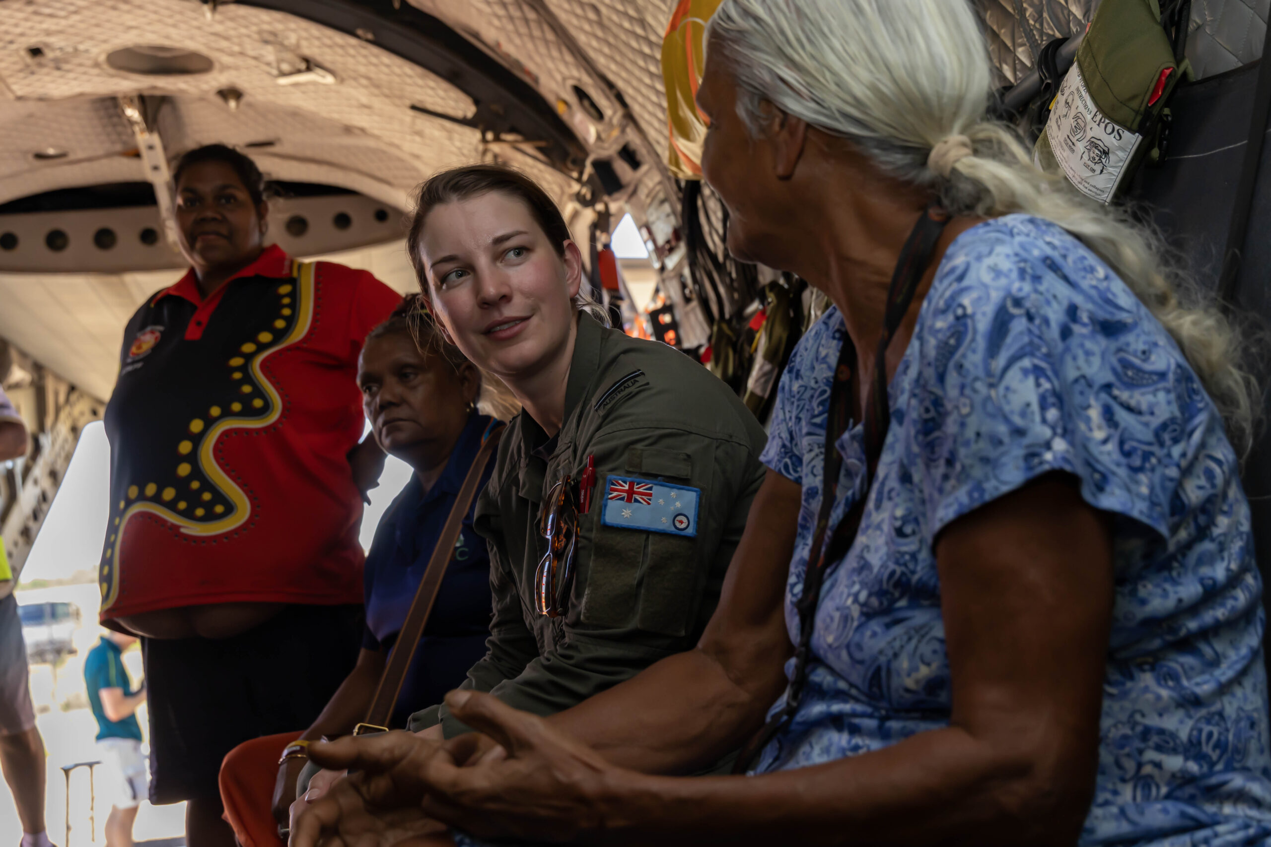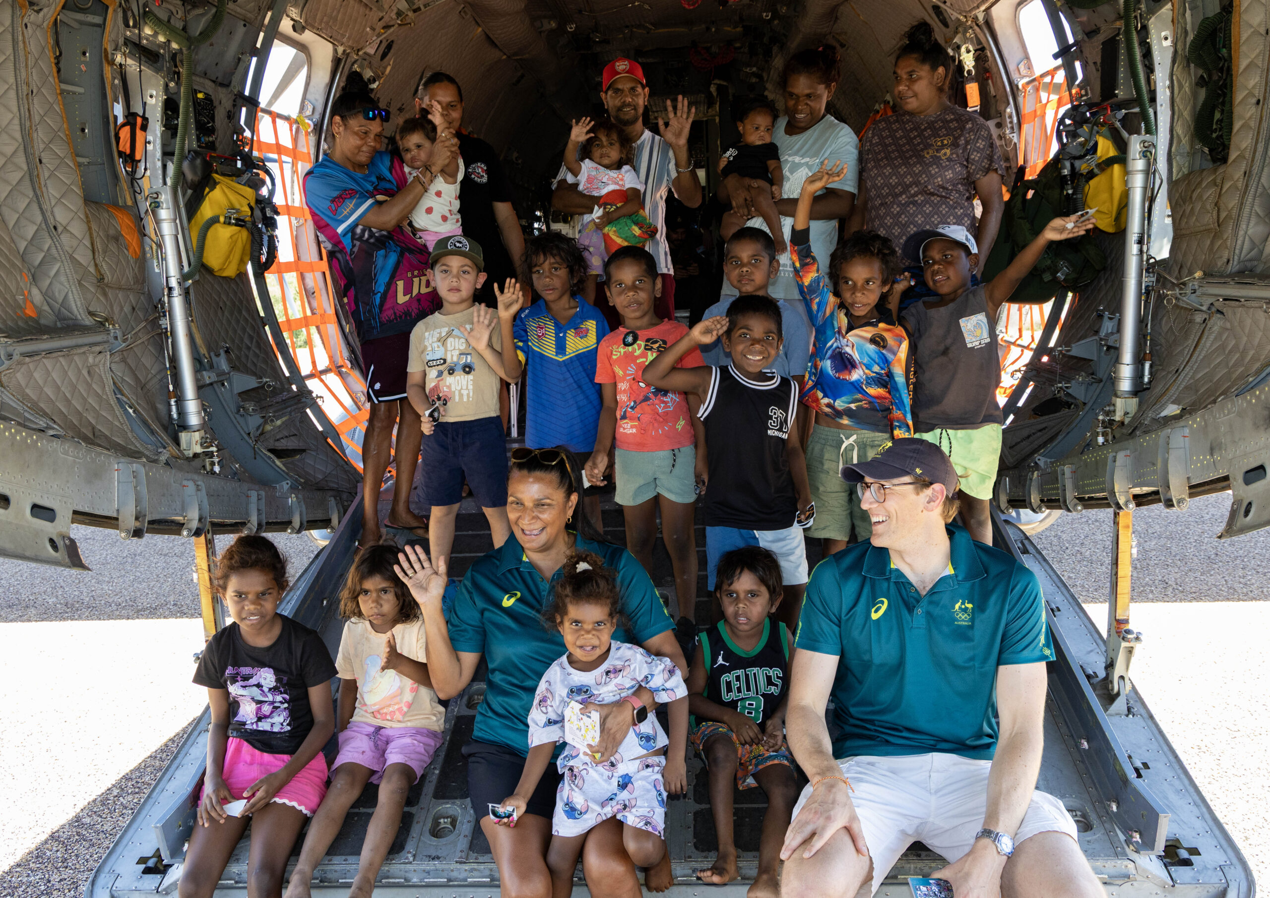 Locals from Doomadgee gather for a group photo with former Australian Olympians Nova Peris, OAM ,(left) and Mack Horton, OAM, on the ramp of a Royal Australian Air Force C-27J Spartan during Exercise Christmas Hop.