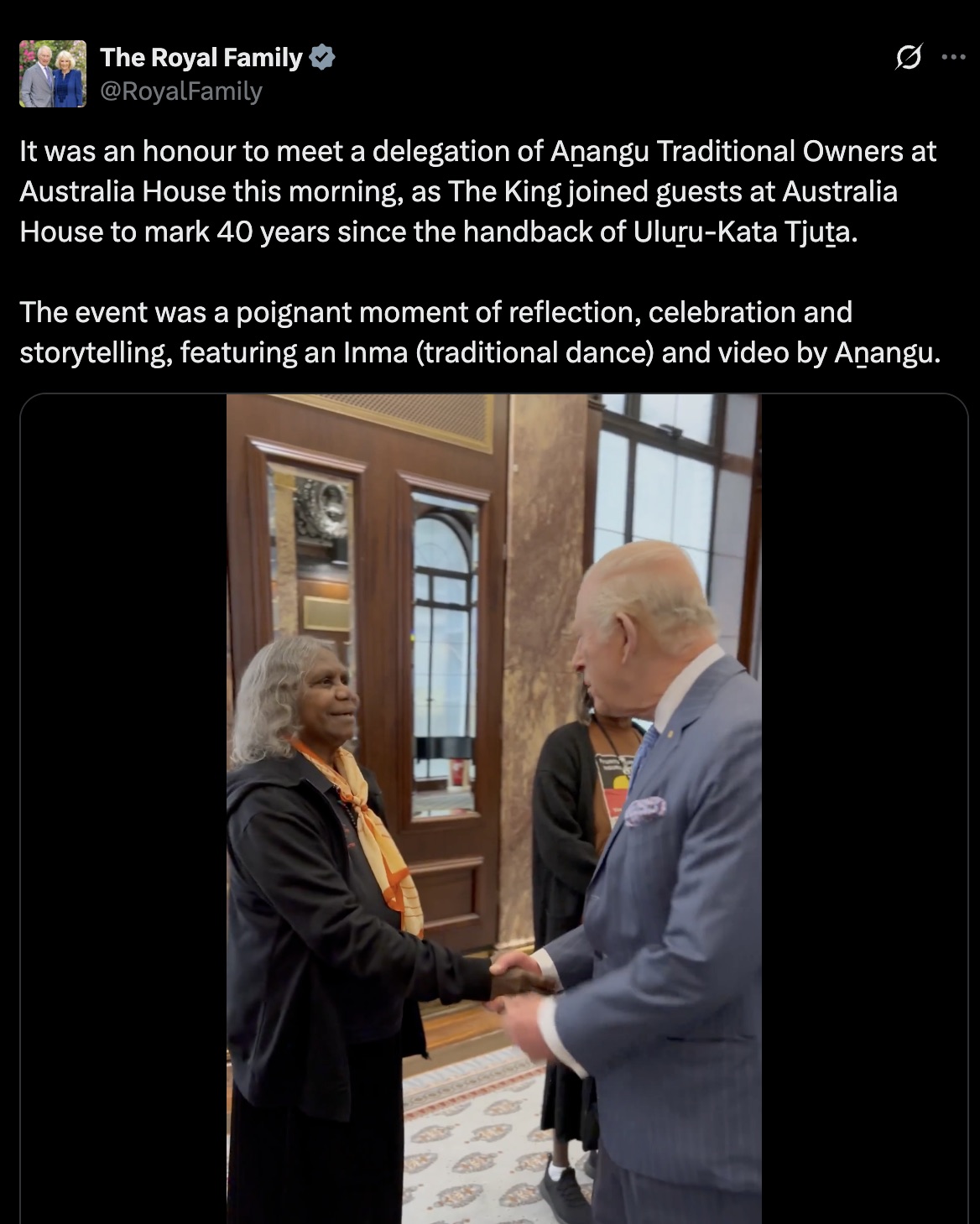 Buckingham Palace said it was an honour to meet a delegation of Aṉangu Traditional Owners at Australia House, as the King joined guests to mark 40 years since the handback of Uluṟu-Kata Tjuṯa.
