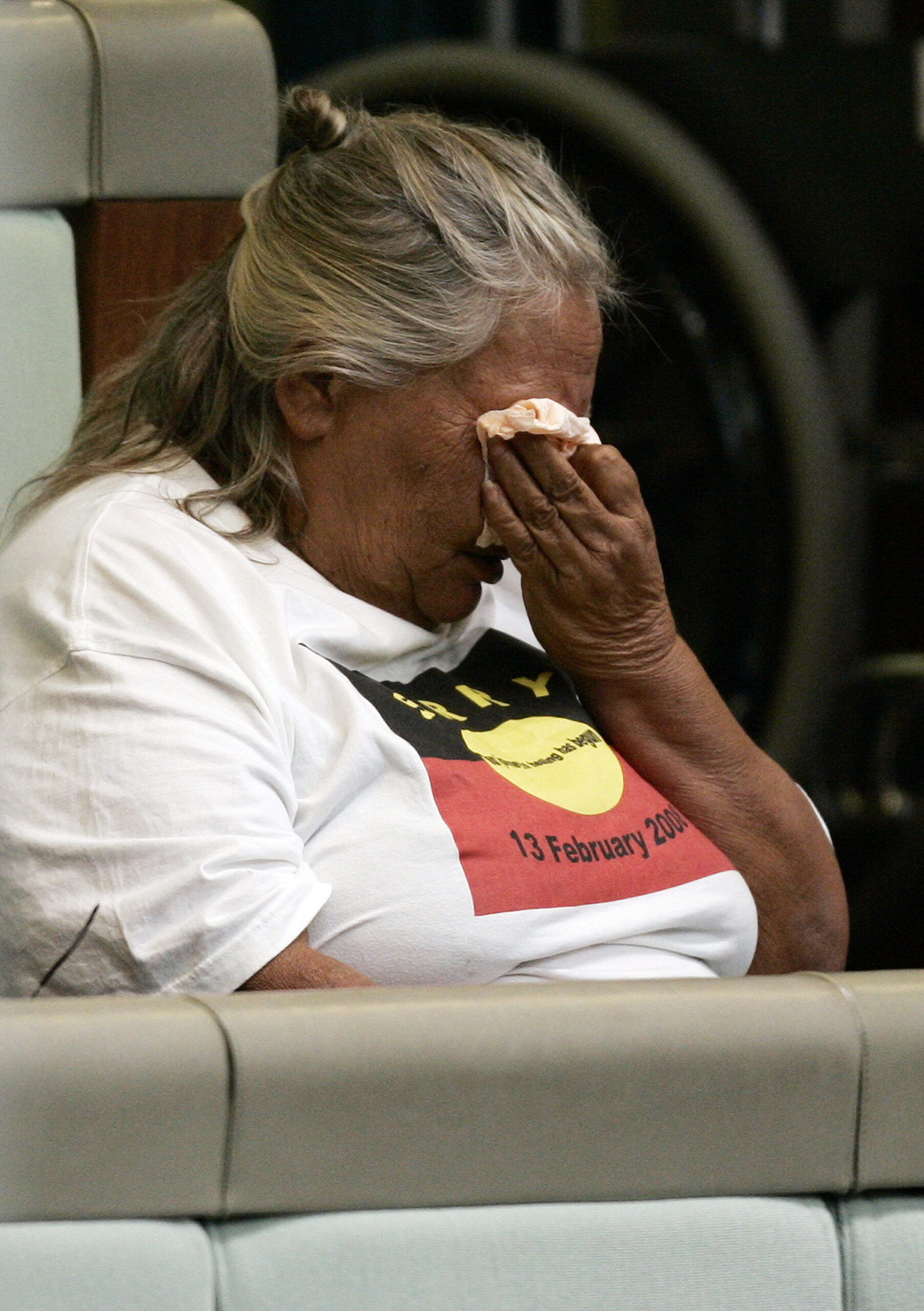 A First Nations woman  wipes her eyes as then Australian Prime Minister Kevin Rudd delivers an apology to the Aboriginal people for injustices committed over two centuries of white settlement.  (AAP Image/Andrew Sheargold)