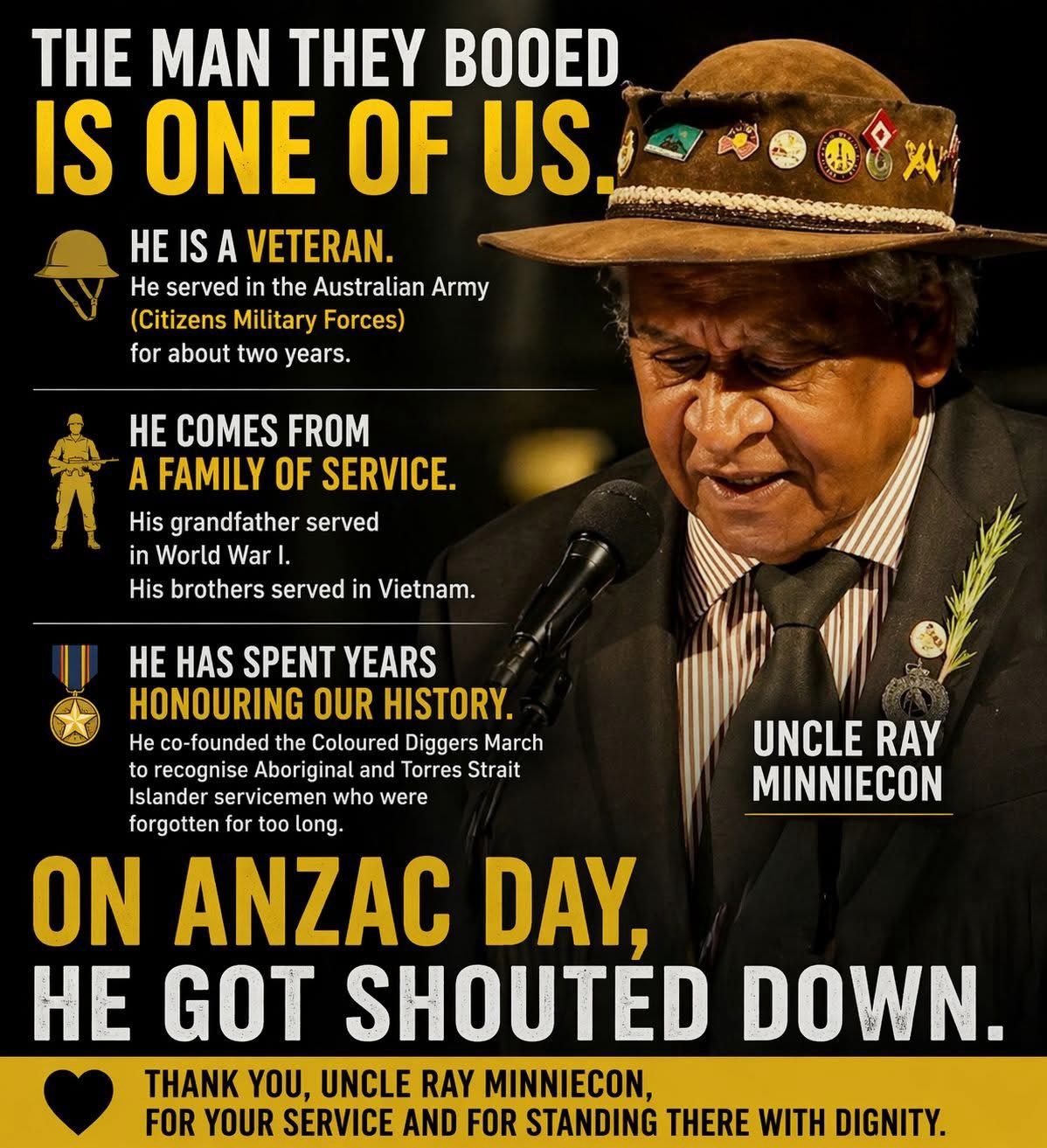 Uncle Mark Brown was heckled at the Shrine of Remembrance in Melbourne.