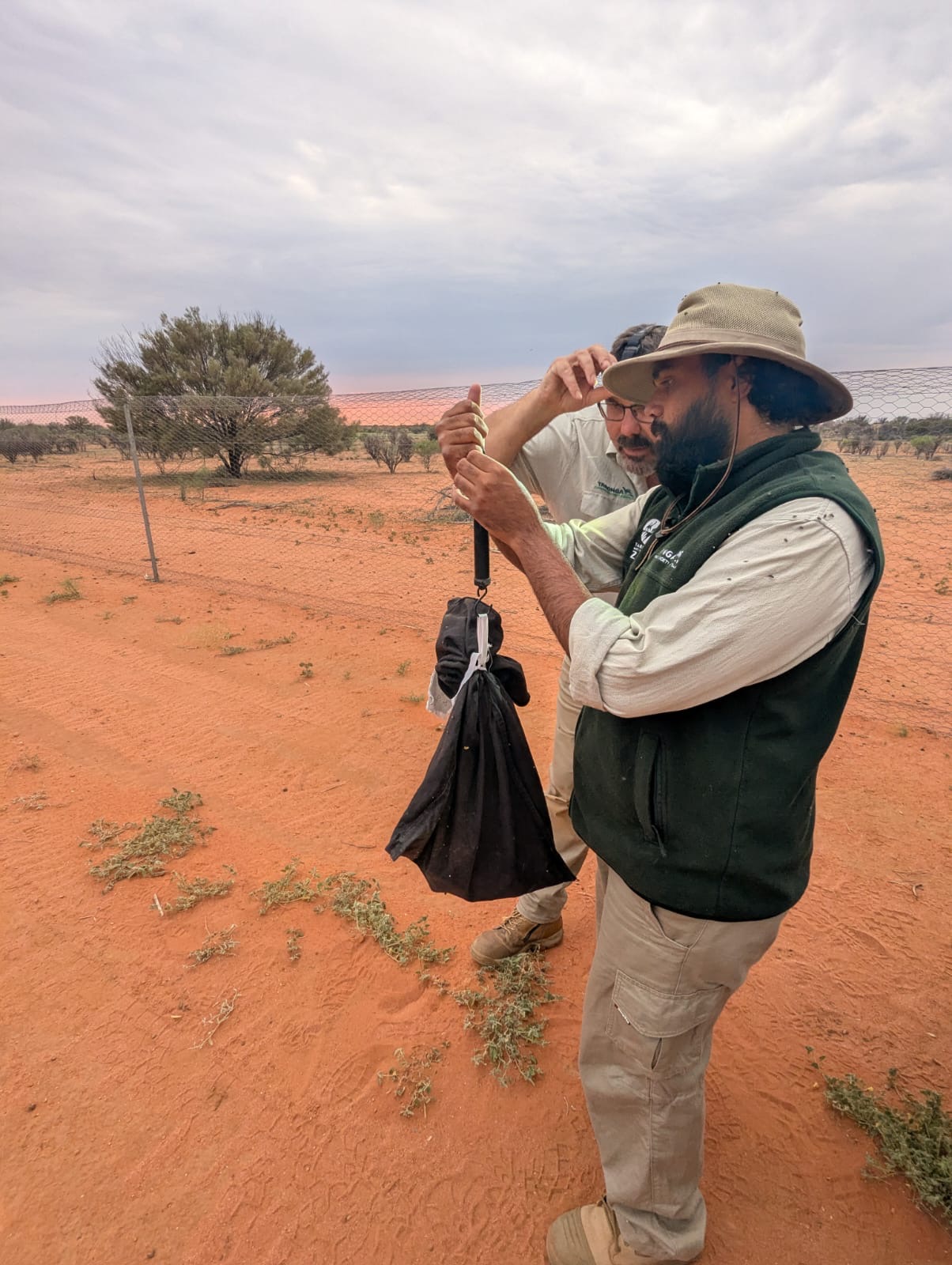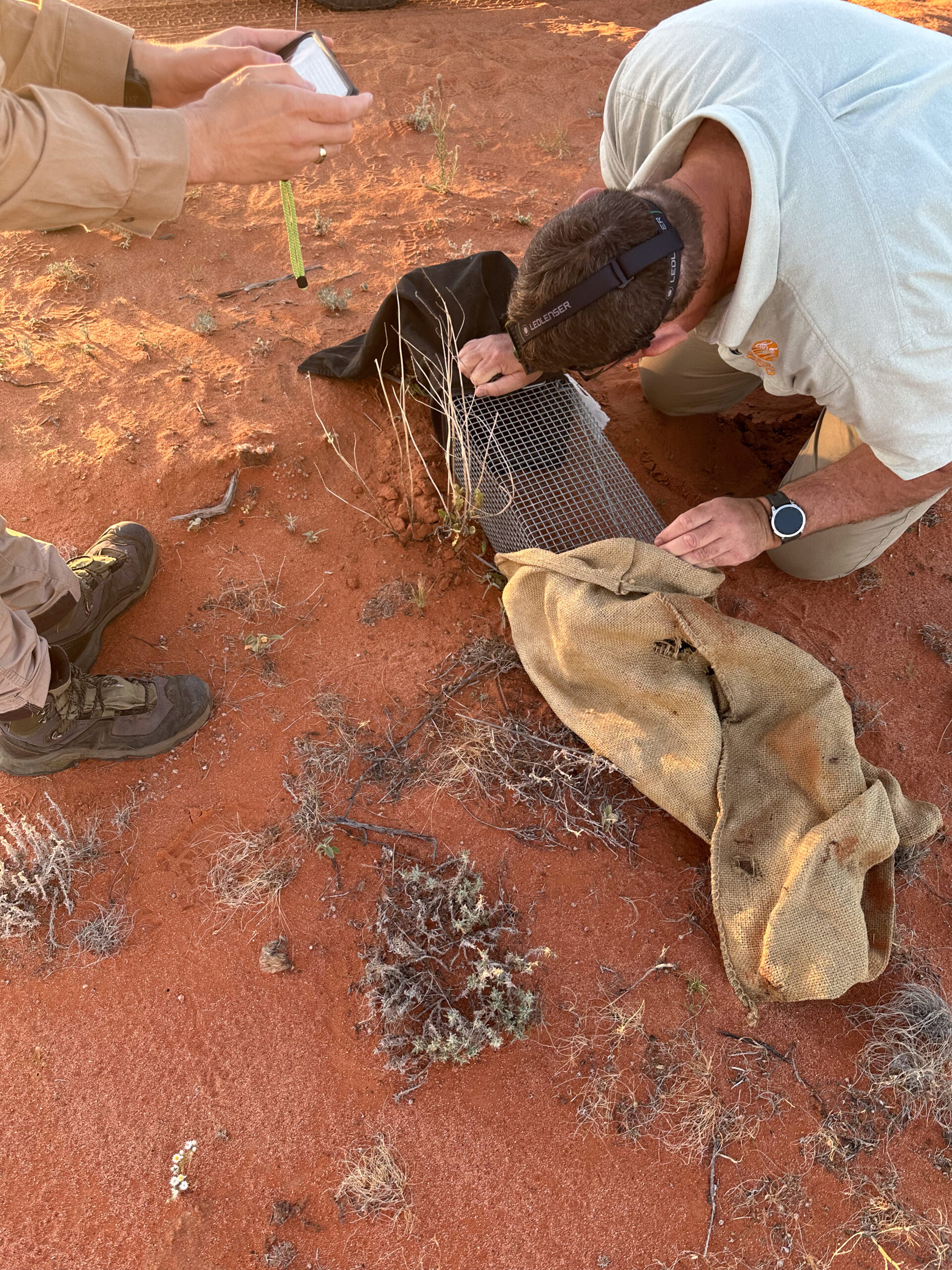 Taronga Counservation Supervisor Steve Kleinig inspects a trap at Sturt National Park.
