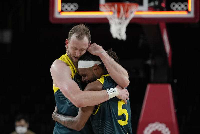 Joe Ingles and Patty Mills produced one of the most memorable moments of the Tokyo Olympics. (AP)