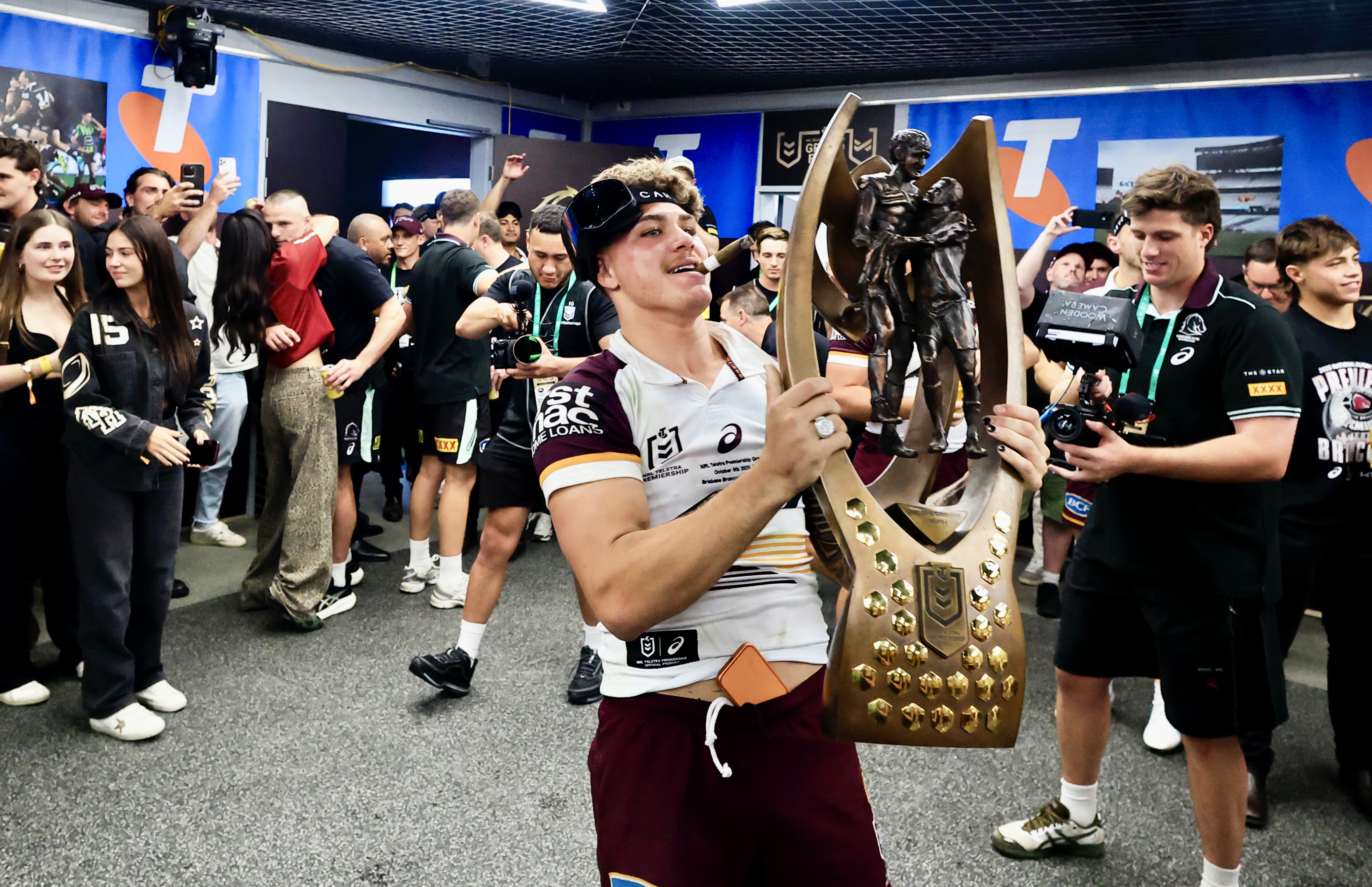 Reece Walsh  holds up theTrophy in the sheds after winning the NRL Grand Final (AAP Image/Mark Evans)
