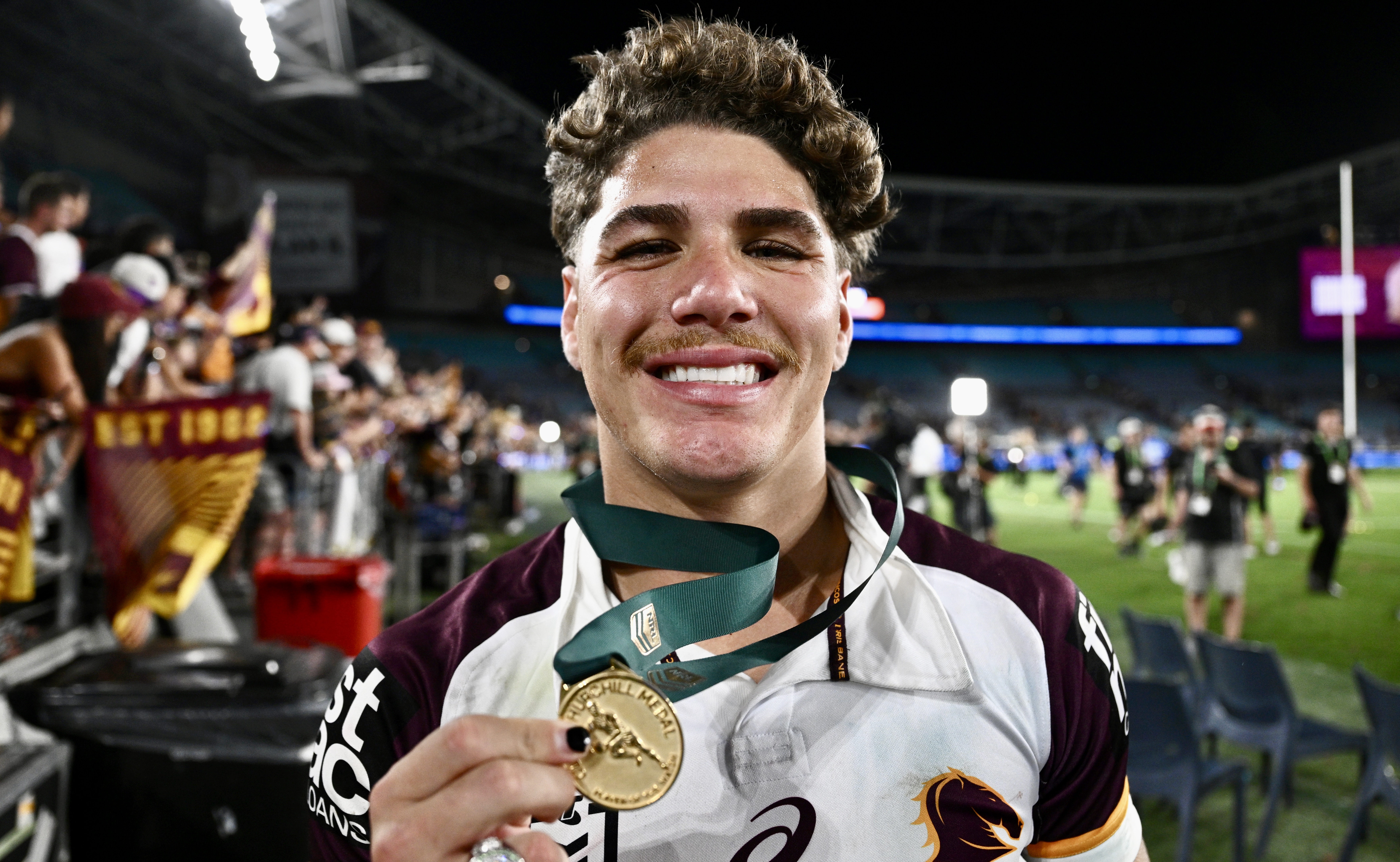 Reece Walsh  celebrates with the Clive Churchill Medal after winning the NRL Grand Final  (AAP Image/Dan Himbrechts)