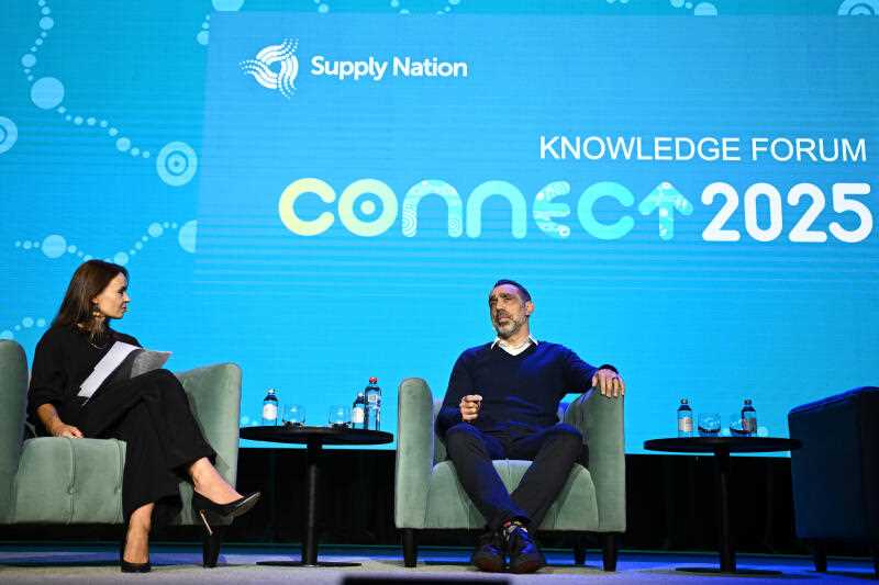 Former AFL footballer Adam Goodes speaks during a Q and A with Supply Nation CEO Kate Russell during Supply Nation’s annual event Connect 2025 in Sydney.