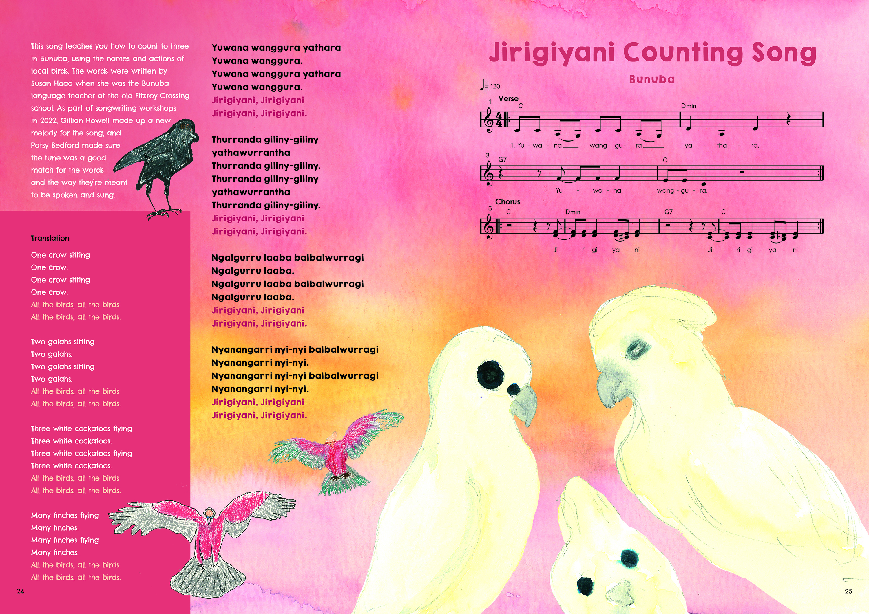 Book details: Buga Yanu Junba Songs for young children by the educators at Baya Gawiy yani Jandu yani u with Gillian Howell and Annika Moses. ISBN: 9781922592729; rrp: $34.99. Languages: Bunuba, Gooniyandi, Walmajarri, Kimberley Kriol with English translations.