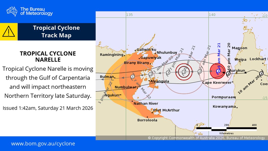 But the Bureau of Meteorology has warned residents from Nhulunbuy to Port McArthur, including Borroloola, Numbulwar, Alyangula and Gapuwiyak that Narelle will strengthen as it approaches.