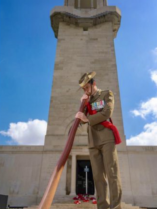 In the stillness of dawn during ANZAC Day in northern France, a deep and unmistakably Australian sound rises across rows of white headstones.