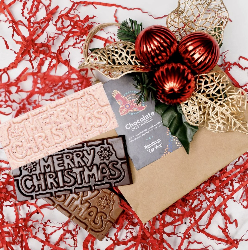 Her latest festive options includes a Merry Christmas bar of white chocolate with Davidson Plum and an Aussie bush food Christmas chocolate hamper that, as well as the white chocolate, has a milk variety with Muntrie Berry and a dark chocolate bar with finger lime – a classic take on dark and citrus.