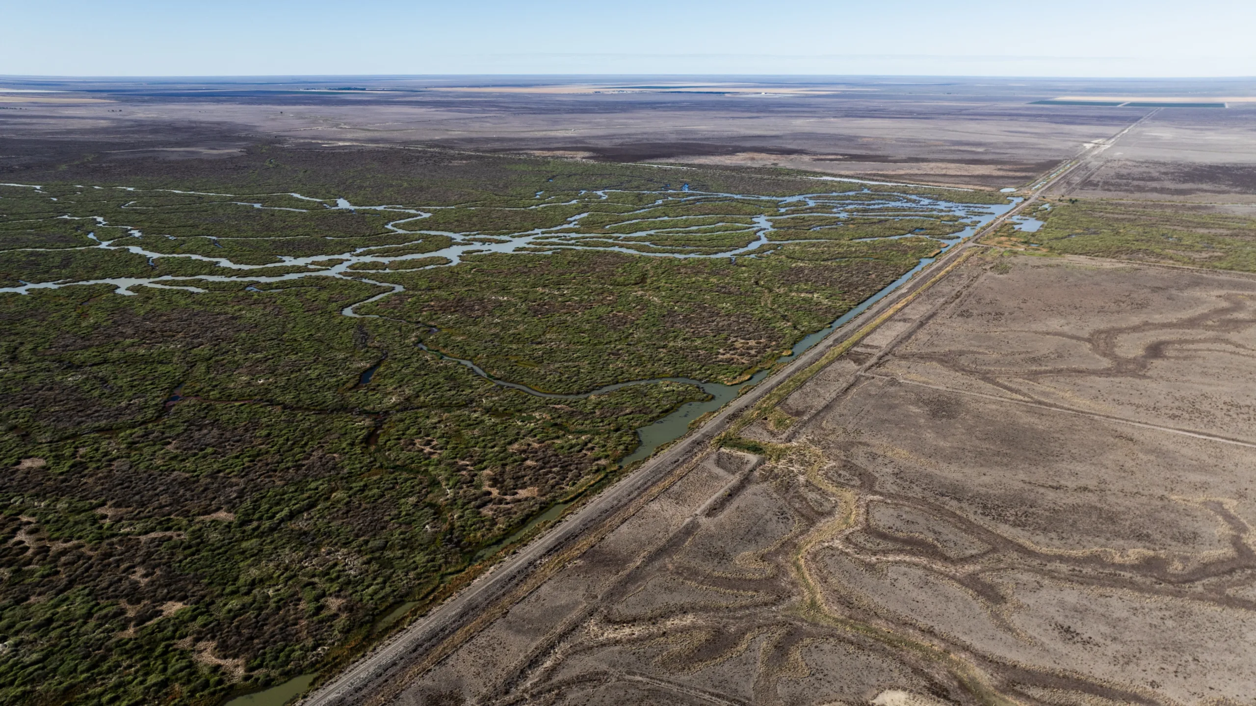 A striking line divides the natural wetlands from laser-levelled irrigation land on Gayini country. On one side, signs of growth and renewal. On the other, the scars of destructive development.